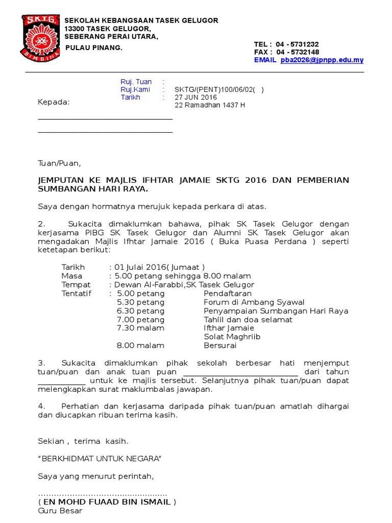 Contoh Surat Kehadiran Ibu Bapa Program Iftor Jamaie By Da_Precious239 04 Jul, 2022 Post a Comment Surat Acara Jemputan Surat Rasmi Jemputan Ke Majlis Iftar Surat Sumb Hari Guru Surat Rasmi Jemputan Ke Majlis Iftar Surat Jemputan Majlis Berbuka Puasa Asnaf Dan Murid Miskin Pdf Share No comments for "Contoh Surat Kehadiran Ibu Bapa Program Iftor Jamaie"